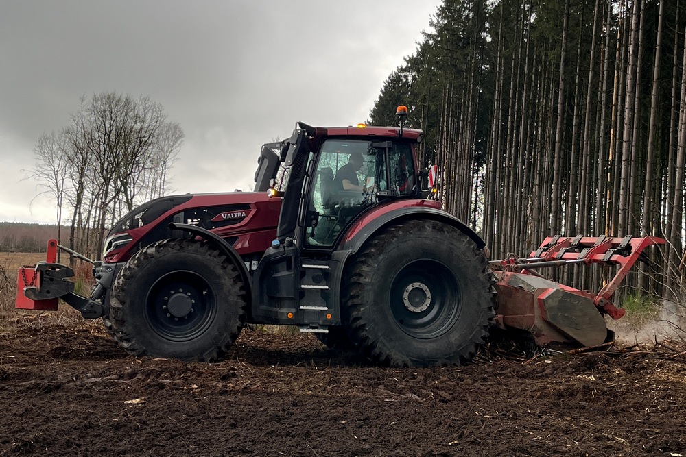 Jean-François Thonus réalise du gyrobroyage avec un Valtra Q 305 équipé de pneus forestiers Nokian Tractor King.