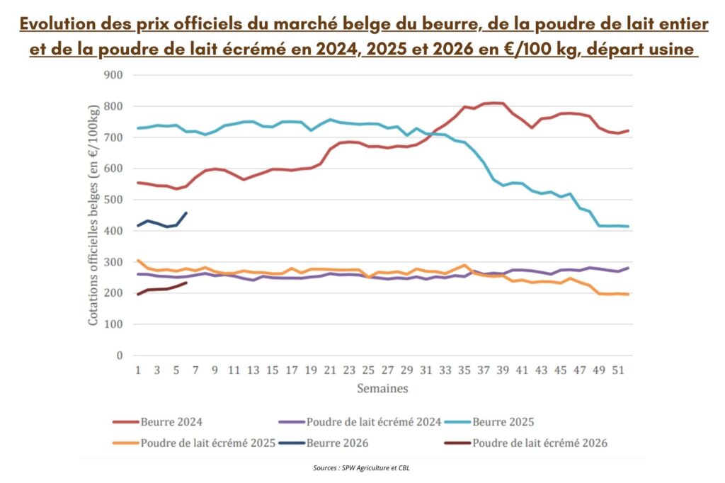 En qui concerne les produits transformés, on constate que depuis le début de l’année 2026, les cours du beurre et de la poudre de lait écrémé sont repartis à la hausse : + 9,7 % pour le beurre durant les six dernières semaines et + 19 % pour la poudre de lait sur la même période. Cette tendance pourrait s’expliquer par une augmentation des achats à prix bas par certains pays afin de (re)constituer des stocks. Toutefois, la consommation restant relativement stable et la production élevée, il pourrait s’agir d’une tendance temporaire.