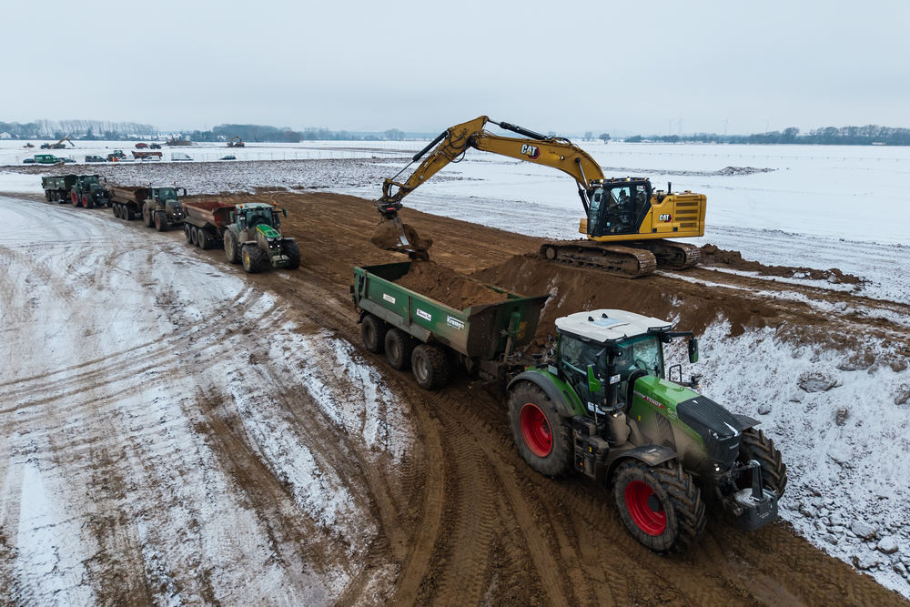 Par une matinée glaciale aux environs de Hanovre, un léger voile de neige recouvrait le chantier. Bulldozers à chenilles, excavatrices et tracteurs attelés de remorques traçaient des sillons sombres dans la surface blanche. Au milieu : deux nouvelles Krampe HD700, tout juste sorties d’usine et prêtes pour leur baptême du feu.