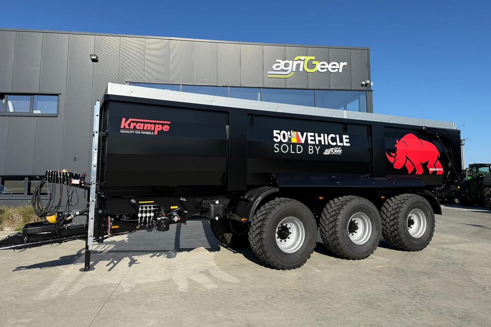 Pour marquer le cap du 50ième véhicule vendu, AgriGeer DAJE a proposé une benne en édition spéciale en collaboration avec Krampe. Ainsi, la caisse de couleur noire reçoit des autocollants spéciaux, dont un rhinocéros rouge avec un design particulier. C’est Raphaël Bauche qui utilise cette benne : “L’édition spéciale a un look qui me permet de me distinguer des autres utilisateurs. J’aime avoir du matériel haut de gamme qui se distingue.”