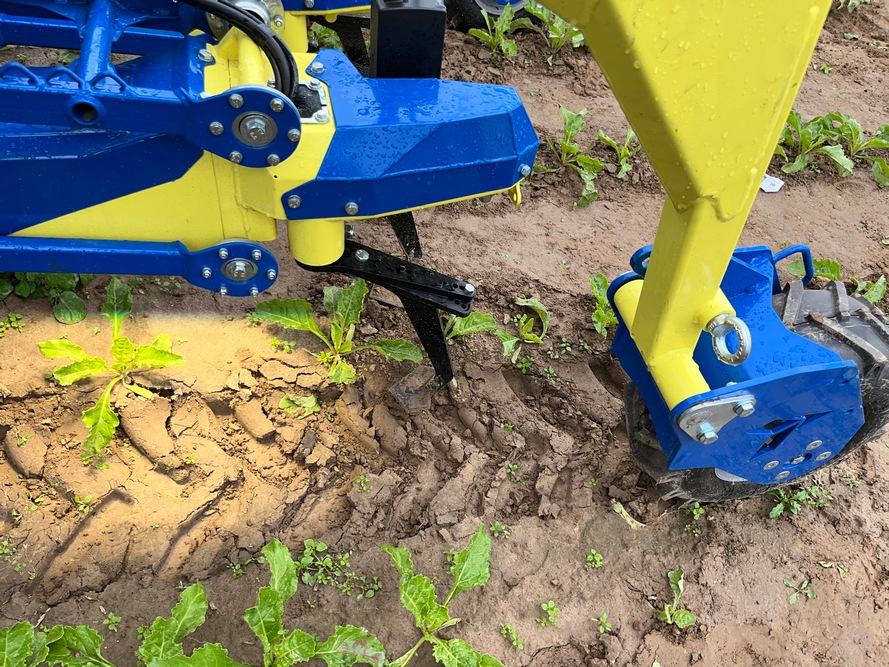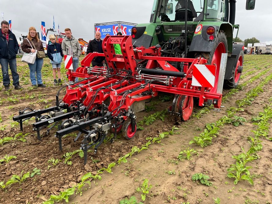 Lors de la démonstration, nous avons aussi découvert une bineuse Kult permettant également de biner dans le rang. Cependant, elle ne contente pas de travailler uniquement dans les lignes de semis, car elle est aussi dotée d’outils fixes pour désherber les inter-rangs. Cet outil repose donc sur l’utilisation d’une caméra par rang pour désherber entre les plantes. Le logiciel d’intelligence artificielle analyse les images générées pour déterminer le centre de la betterave sucrière. Grâce à ces informations, les couteaux inter-rangs peuvent travailler avec précision tout autour de la betterave.